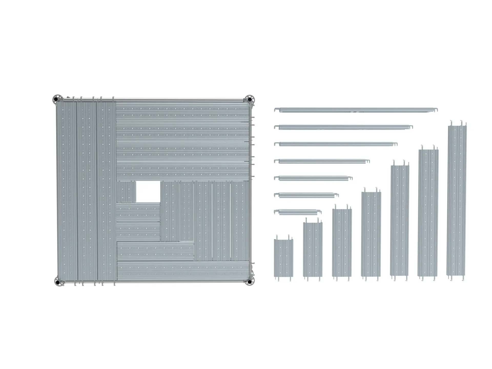 Composed of steel panels, beams, and support elements that can be configured for multiple projects, promoting cost efficiency.
